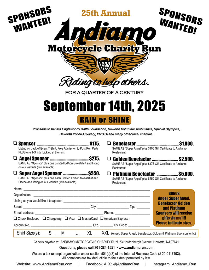 to become a sponsor at any level or for more information contact us Phone: 201-384-1551 or e-mail: info@andiamorun.com